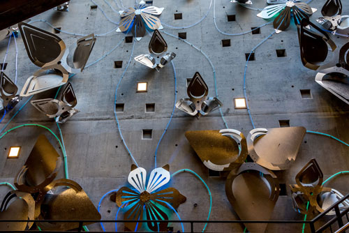 Inspired by Texas wildflowers and Alice’s Adventures in Wonderland, Golden Afternoon is a responsive public art installation in the parking structure of the Seaholm Redevelopment Project. The installation mimics a hanging garden that has overgrown from the flower beds on the ground level, down the open stairwell, and making its way into the parking lot. Reminiscent of a trip down the rabbit hole from Alice’s Adventures in Wonderland, the artwork experience is heightened by lighting which responds to people moving up and down the stairs.